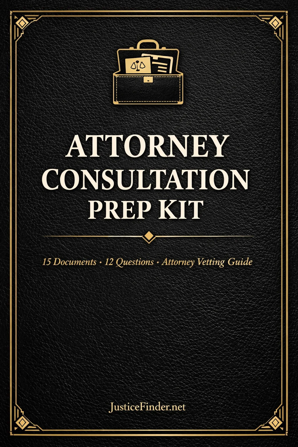 Delivers a pre-consultation document checklist, 25 questions to ask the attorney, a contingency fee evaluation guide, and a post-meeting decision framework in one printable PDF.